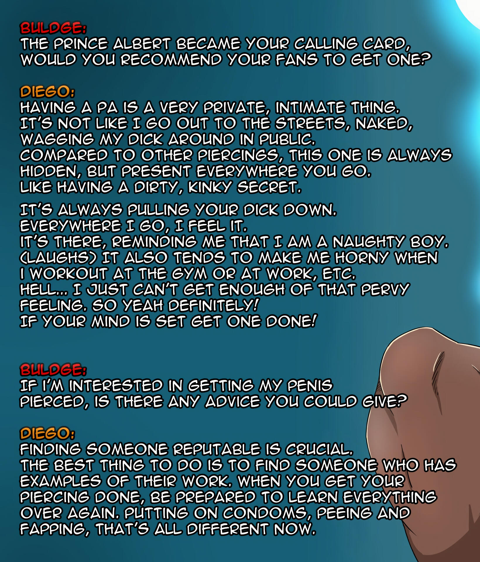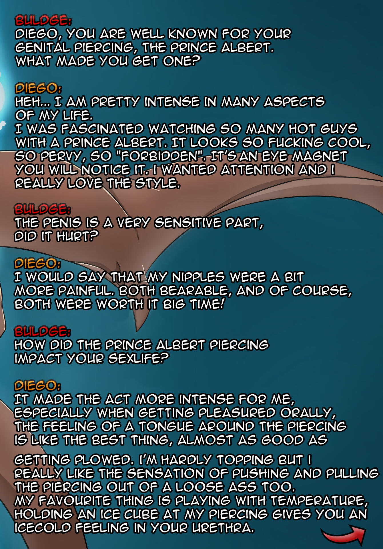 Diego's kind and gentle nature can be very deceptive, because he is secretly very perverted. Having his penis pierced has increased his sensitivity, intensifying his sexual desire and perverted-ness.He loves getting plowed and aims to induce an orgasm without having his 20cm/8" cock touched. Although he almost never tops, he enjoys moments when he does. He remains dominant despite if he's the giver or the receiver.Diego likes getting messy and going to "intense" sexual acts, such as gagging, humiliation (towards the other partner), public sex, etc.Due to his prince albert, he has a constant risk of getting hard and horny while just performing daily tasks, such as gymming, running, or working. The piercing is always tugging his (pretty sensitive) cock and he just can't get enough.