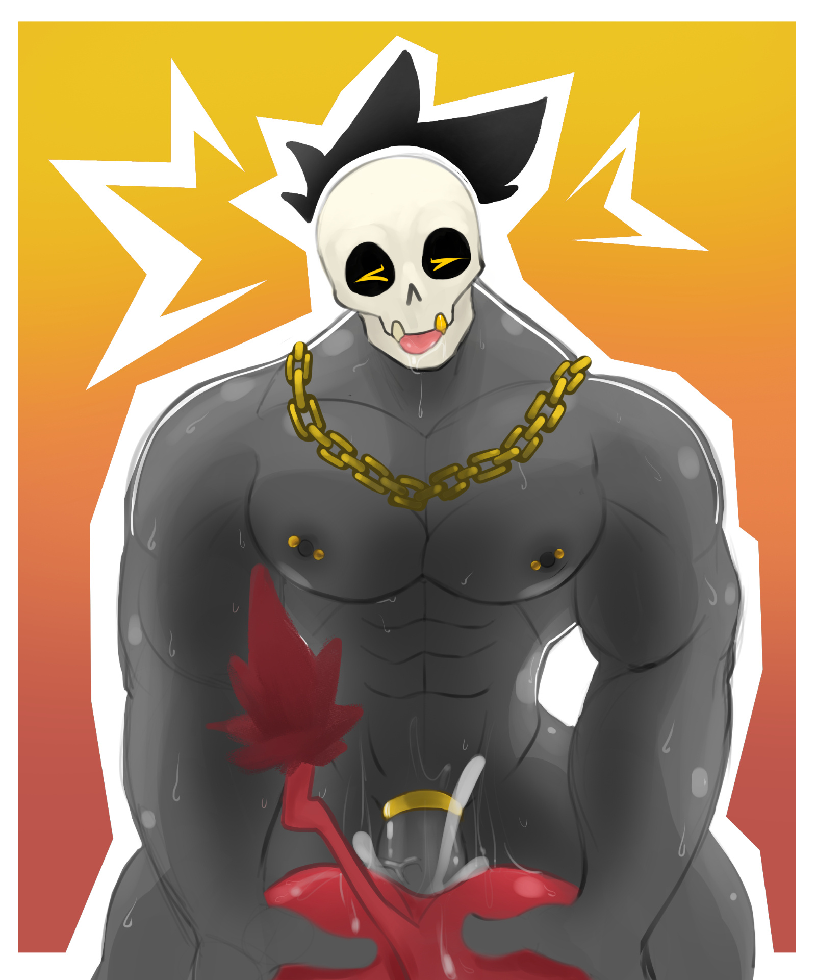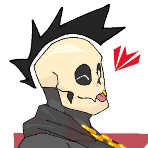 Sebastian is a skull-head character and has somewhat of a soft personality. His height is 183cm/6', is cis, and goes by the pronouns he/him.He is homosexual and demiromantic.Sebastian has a golden tooth, a golden chain necklace, and golden nipple piercings. A bit of an edgelord, though he is actually soft and shy. However when he's in a flirty mood he becomes somewhat confident.He has barbell nipple piercings but it might be missing in some art. I allow artists to exclude them if they do not feel comfortable including it in their art.